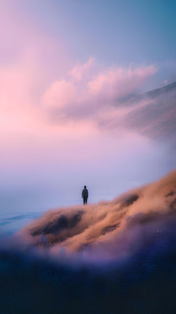 A solitary person sits quietly at the edge of a fog covered bridge, surrounded by an atmosphere of solitude and mystery during early morning.