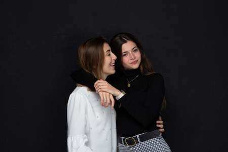 Portrait of two happy women friends with loving gestures laughing on a black background - Concept of friendship
