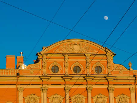 Stucco molding on the top part of a facade of the building against the sky with clouds in Saint-Petersburg, Russia