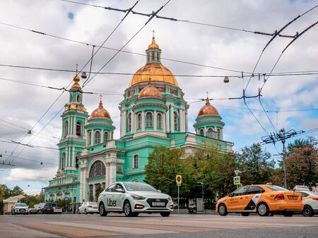 Moscow, Russia - September 14, 2019: Epiphany Cathedral at Yelokhovo is vicarial church of Moscow Patriarchs. In foreground are taxi cars of most common brand in city - UBER, Yandex-taxi and Citymobil
