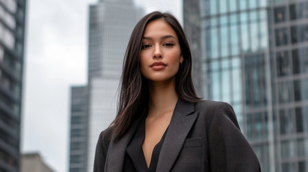 A confident fashion model stands outdoors in a chic outfit, showcasing her style against skyscrapers in an urban setting during the daytime. The modern city skyline creates a striking contrast.