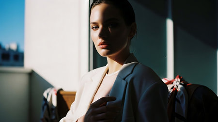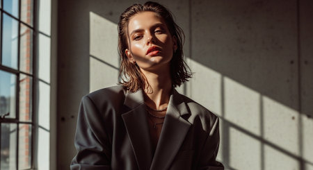 A young woman with shoulder-length hair wearing an oversized blazer, posing in a sunlit room with shadows on the wall