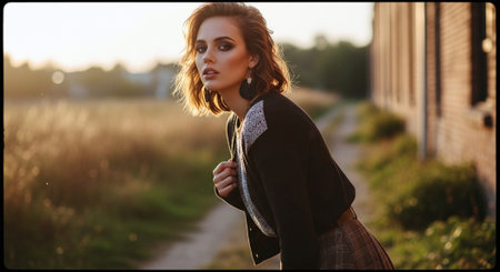 A young woman with short hair poses outdoors during golden hour, wearing a stylish outfit with a cardigan and a skirt, surrounded by tall grass and a rustic building in the background