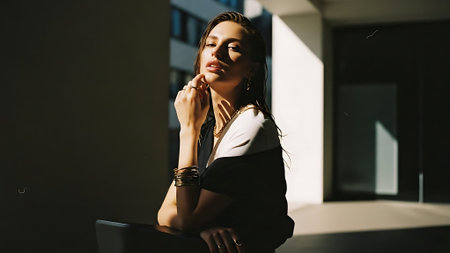 A confident woman in a stylish black blazer, standing in soft light with shadows, showcasing a modern and elegant look