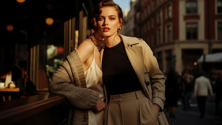 A confident woman in a stylish outfit poses dramatically in low light, showcasing elegance and sophistication