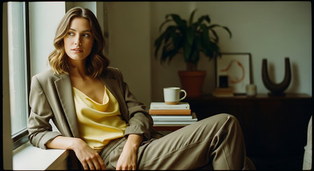 A stylish woman in a beige blazer and satin top, posing confidently in front of a large softbox light, with a modern interior background