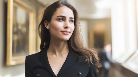 A young woman in a black blazer looks thoughtfully to the side, with a blurred background suggesting an indoor setting like a museum or gallery.