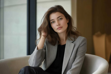 Young, confident businesswoman adjusting her hair while sitting in a modern office space, exuding professionalism and style