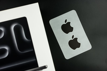 Bangkok, Thailand - December 24, 2023 : The iconic black Apple Computers logo sticker comes with MacBook Pro M3,the latest MacBook Pro in 2023
