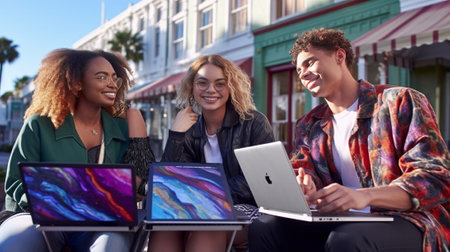 Surfing the net together Four happy young people looking at laptop and smiling while sitting outdoors together : Generative AI