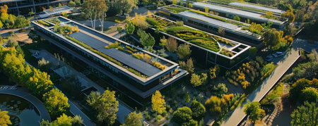 A view of a contemporary corporate campus featuring sustainable architecture, lush landscaping, and innovative walkways made of solar panels with people walking by.