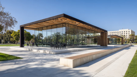 A stunning modern glass pavilion stands proudly in an urban park, embraced by vibrant greenery and bathed in sunlight, creating an inviting space for leisure.