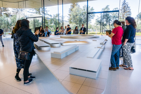 March 8, 2018 Cupertino / CA / USA - People at the Apple Park Visitor Center in Silicon Valley explore the new Apple Offices using a scaled-down replica of the campus and a virtual reality program