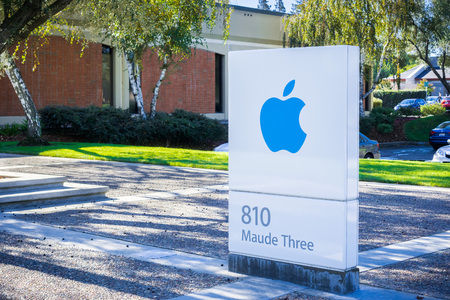 Cupertino, CA, United States - August 12, 2018: Apple sign of the new Apple Headquarters and Apple Park Visitor Center in Tantau Avenue of Cupertino, Silicon Valley, California.