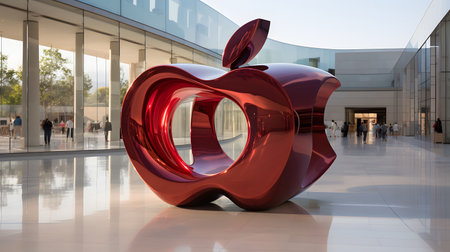 An AI generated illustration of An architectural sculpture of a large apple is showcased in the interior of an expansive building