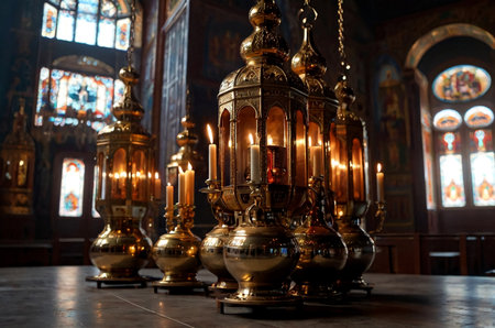 Iron censers hanging above large icon in orthodox church or temple for ceremony easter. Background lighted wax candles religion, icon-lamp in temples. Concept of church backgrounds. Copy space