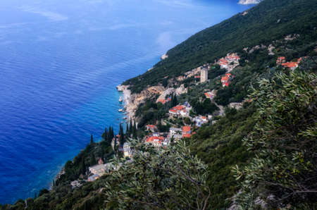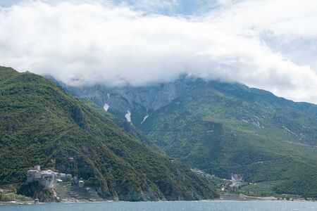 Seaview of the old Dochiariou monastery in Athos mount, Halkidiki , Greece