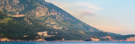Adriatic sea coast with mountains in Montenegro, view on Sveti Stefan island at the sunset time, nature landscape.
