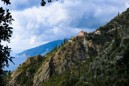 Scenic landscape of St Andrews Skete, orthodox church on Mount Athos, Macedonia, Greece