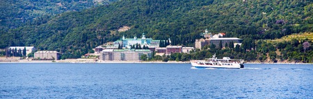 Ouranoupolis , Greece - June, 1, 2015: Panorama of Russian St. Panteleimon's Orthodox monastery at Mount Athos, Agion Oros, Holy Mountain, Halkidiki , Greece and the ship near it