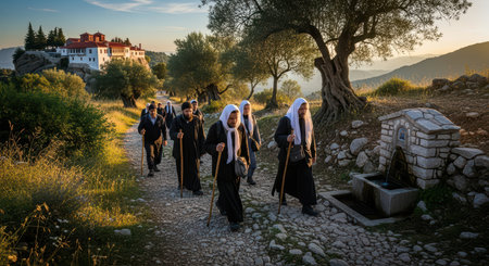Group of monks walking on rocky path in rural landscape at sunset