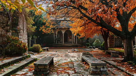 A stone courtyard with autumn leaves and a stone bench sits in front of a stone building. The leaves are mostly red and orange and cover the ground and some of the benches.