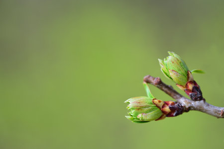 Close-up of delicate spring buds jutting sideways into the image against a green background, with space for text