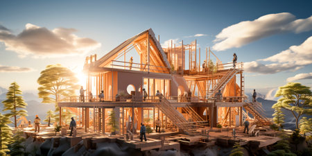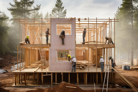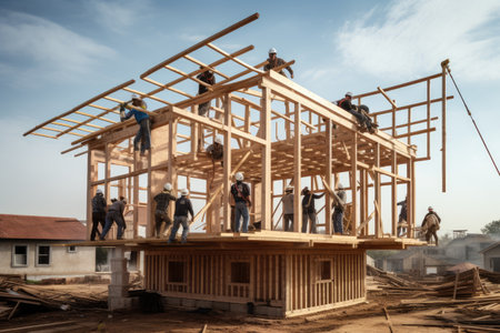 Workers assembling prefabricated house , Construction workers assembling a prefabricated house, AI generated