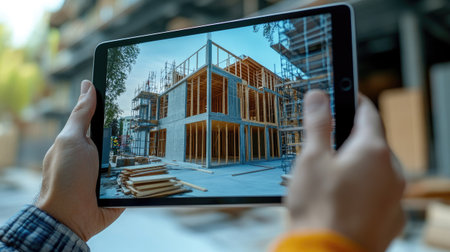 Architect is holding a tablet displaying an unfinished modern apartment building at a construction site