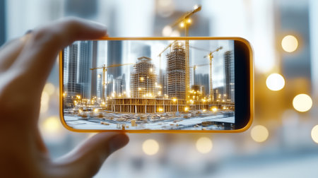 Hand holding smartphone capturing construction site with cranes and skyscrapers. Urban setting during sunset, showcasing development and architecture. Concept of real estate, construction, technology.