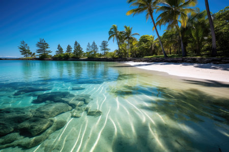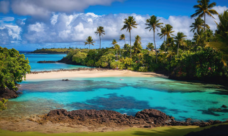 A secluded, white sand beach with crystal clear water and swaying palm trees on a tropical island