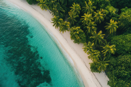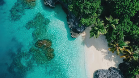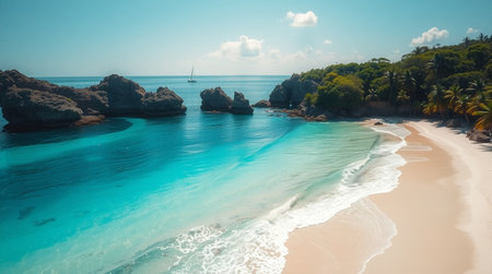 Captivating aerial view of a pristine tropical beach, featuring clear turquoise waters that gently lap against the shore, surrounded by lush greenery. Perfect for travel inspiration.