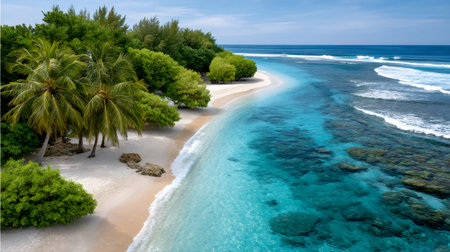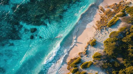 Discover a breathtaking aerial view of a serene tropical beach meeting a vibrant blue ocean. Experience the beauty of nature and tranquility.