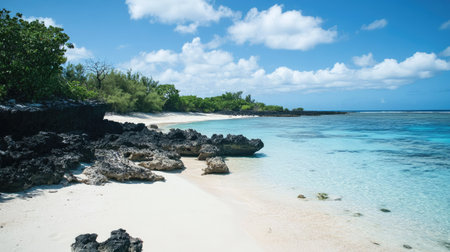 A tranquil tropical beach featuring clear water and rugged rocks, surrounded by lush greenery under a sunny blue sky with fluffy clouds, perfect for relaxation.