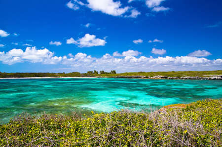 Beautiful seascape of natural swimming pool of Oro Bay, Isle of Pines, New Caledonia. aquamarine translucent water.
