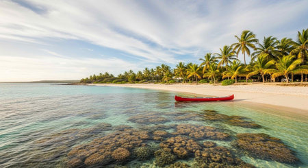 A breathtaking view of a serene tropical beach featuring soft sand, clear blue water, and lush palm trees under a sunny sky, perfect for relaxation.
