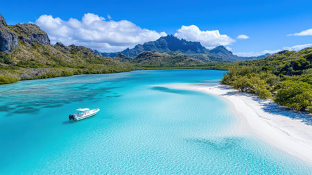 Aerial picture of the east coast of Mauritius Island. Beautiful lagoon of Mauritius Island shot from above. Boat sailing in turquoise lagoon.