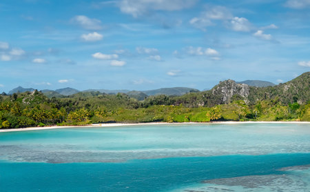 Seascape, coast of the island of Siargao, Philippines. A small island with a white beach and palm trees. The nature of the Philippine Islands.
