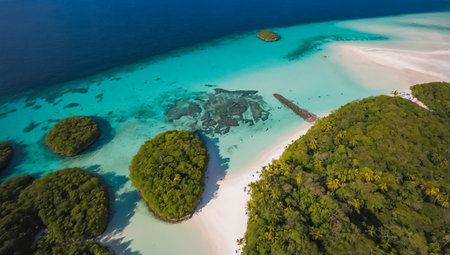 This stunning aerial image captures the breathtaking beauty of coral reefs surrounded by clear, turquoise waters in a serene tropical landscape.