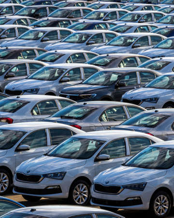 Rows of a new cars parked in a distribution center on a cloudy day in the spring, a car factory. Parking in the open air.