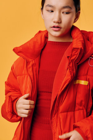 Young woman wearing a bright red winter jacket over red dress posing against a solid orange background. Fashion model with casual look in warm clothing for cold weather style portrait.