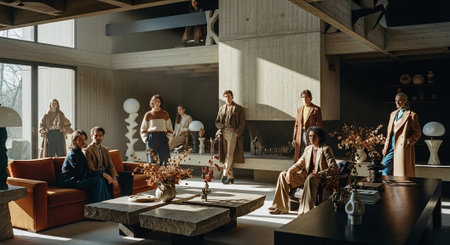 Interior of modern living room in loft style with furniture and people