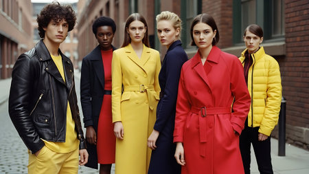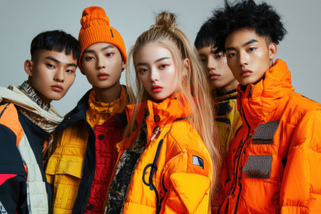 Five young, stylish fashion models are posing together, showcasing trendy bright orange winter jackets and other colorful clothing