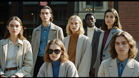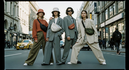 Four young adults posing confidently on a city street with modern fashion