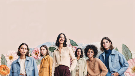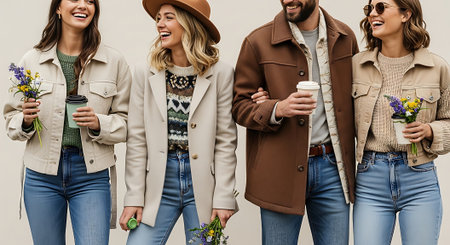 Four friends walking together in casual spring clothing with flowers