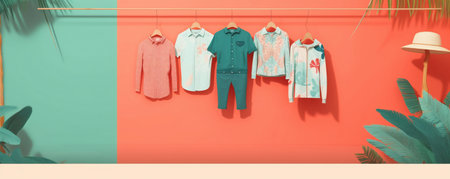 Summer dresses and shirts hanging on a fashionable womens closet wallpaper. Creative concept of a womens clothing showroom.
