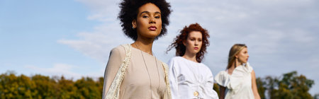 beautiful multicultural women in spring outfit posing together isolated on beige