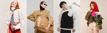Collage. Stylish young people, boy and girls in colorful clothes posing over grey background. Youth culture. Concept of modern fashion, art photography, style, queer, uniqueness, ad