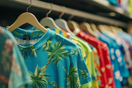 Vibrant children s clothing display colorful t shirts on hangers in a shopping center setting