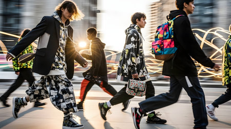 A group of young male models walks briskly down a city street wearing trendy urban streetwear with bold patterns. The image features a dynamic motion blur effect and warm backlighting, capturing the energy and style of modern youth culture.